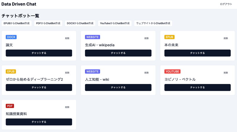 このチャットサービスでは、以下の画像のようにデータごとにチャットボットを作成することができ、GPT-3.5、GPT-4を利用してそのデータに関する質問などを行えるようになっています!